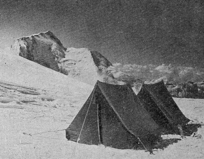 Разбиваем палатки лагеря №4. Ночевка на высоте 6500 м организована с возможным комфортом. В соседней палатке шумят примуса, в палатках тепло и почти уютно, хотя снаружи бушует вьюга. Сильный ветер сорвал оттяжку нашей палатки, выхожу исправить повреждение. Холодный, обжигающий ветер несет мелкие ледяные иглы; пробивая штормовой костюм, они тают под одеждой. Завязать оттяжку, не снимая рукавиц, не удается, без них же пальцы мгновенно коченеют. С трудом закрепляю оттяжку и забираюсь в палатку. Чай готов. Долго отогреваюсь в спальном мешке после неприятной прогулки. 21 августа. Прекрасная, ясная погода. Хорошо виден подъем по вершинному гребню. Тепло одеваемся. Предстоит нелегкий путь, а трудности с высотой возрастают. Рыспаев и Ковырков ночью жаловались на головную боль, но сейчас чувствуют себя хорошо. Выходим всей группой. Пересекаем круто обрывающийся на юг снежный склон, траверсируя его около скал. Впереди преграждают путь четыре «жандарма». Первые три обходим легко, последний, самый мощный, обходим сначала по заснеженным выступам скал, но скоро траверс становится невозможным, приходится подняться по крутому кулуару. Из-под ног часто срываются громадные камни, грозящие сбить идущих ниже. По веревке вся группа выбирается на зазубрину четвертого «жандарма». С попеременной страховкой траверсируем крутые заснеженные черепитчатые скалы. Медленно продвигаемся вперед; движения стеснены, чувствуется разреженность воздуха. По пути встречаются скрытые поперечные трещины, расположение которых нельзя определить заранее. Вот последний взлет гребня, за большим провалом видна наша цель – главная вершина пика Корженевской. При подъеме мы еще ни разу не видели ее. Через некоторое время выходим на северо-западную вершину пика, которая была побеждена в 1937 г., и долго роемся в снегу на скальном выступе. Наконец, мне удается обнаружить консервную банку с запиской группы Гущина, завернутой в пергамент. «Восхождение совершено на северо-западную вершину пика Корженевской 1937 г. 23 августа в 16 часов, высота 6910 м по альтиметру, экспедицией Высшего совета физической культуры при СНК СССР. Участник Науменко остался в лагере «6400 м» по болезни. День был солнечный. Температура на солнце на вершине -13°. Спуск начали в 16 часов 25 минут. Участники чувствуют себя превосходно». Продолжаем путь, стремясь организовать пятый и последний высотный лагерь №5 как можно ближе к вершине. Теряем 90-100 м высоты, спускаясь по крутому снежному склону на седловину у подножья главной вершины. В 17 ч. 30 м. на ровной снежной площадке, защищенной от ветра, разбиваем бивак. Вершина кажется близкой, и наиболее нетерпеливые товарищи предлагают до наступления темноты сходить на нее, воспользовавшись хорошей погодой. К вечеру задул холодный ветер, но в палатках тепло. Греем чай, предлагаю без ограничения пользоваться любыми продуктами, однако все едят мало, даже и те, кого стеснял режим жесткой экономии продуктов в нижних лагерях. Ночью непогода. Мелкие снежинки, гонимые сильным ветром, проникают внутрь палатки. Наши спальные мешки и одежда местами начинают промокать и примерзают к полотнищам палатки. Стужа усиливается. Лежим в теплой одежде, в спальных мешках, надев на ноги по нескольку пар шерстяных носков, но это не спасает от холода. За полотном палатки свирепствует ветер. 22 августа.