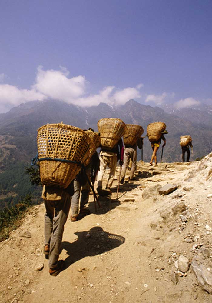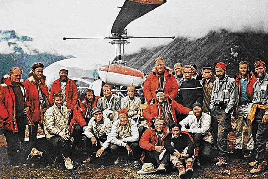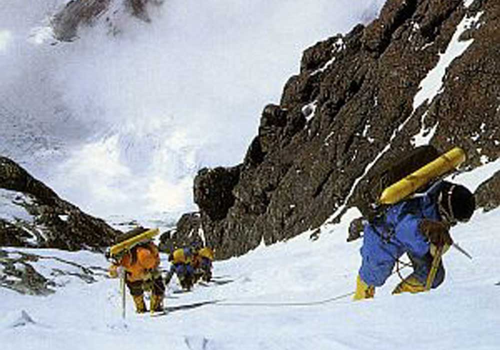 Гиппенрейтер – к.б.н., МС СССР. Весной 1963 г., после неоднократных отсрочек, крупнейшую по масштабам экспедицию снарядили американцы. Они наметили также восхождения на два соседних гиганта – Лхоцзе (8.545 м) и Нупцзе (7.879 м). Экспедицию возглавил Диренфурт Норман, кинопродюссер, участник и руководитель четырех гималайских экспедиций, наиболее опытный высотник США. Диренфурт принял правильное решение по организации крупной по численности экспедиции. Победу над гималайскими восьмитысячниками обеспечивают команды с достаточными людскими резервами. Из 100 кандидатов было отобрано 20. Помимо альпинистской квалификации кандидаты должны были обладать другими полезными навыками в области медицины, связи, фото- и киносъемки, кислородной аппаратуры. Возраст участников экспедиции колебался от 25 до 45 лет, многие имели ученые звания и степени. Трое были бизнесменами, несколько человек учеными, остальные преподавателями. Девять человек когда-то работали горными гидами. А так же фотограф Барри Бишоп (Barry Chapman Bishop) и писатель Дж. Р. Ульман. Осенью 1962 г. члены экспедиции собрались в районе горы Райниер для испытания снаряжения и продуктов. В конце декабря 27 тонн груза были отправлены в Калькутту, еще 2 тонны шли из Европы. В январе 1963 г., пройдя психофизиологические испытания, вылетели в Катманду и участники экспедиции. Большинство весенних экспедиций на Джомолунгму начинали свой путь в марте. Диренфурт решил выйти 20 февраля, и это полностью себя оправдало. Из селения Банепа, где обрывается автодорога, 909 носильщиков племен тамангов и шерпов взвалили на плечи 29 тонн. На носильщика приходилось по 30 кг, не считая личных вещей. За день удавалось пройти от 8 до 15 миль через селения, жители которых живут в потрясающей нищете. К врачам ежедневно тянулись бесконечные очереди. Среди носильщиков и местного населения вспыхнула эпидемия оспы, погубившая около 40 человек. Впрочем, человеческая жизнь в этих краях ценится не очень-то высоко. Диренфурт вызвал по радио из Катманду вертолет и заплатил 2 тысячи долларов за то, чтобы доставить в госпиталь шерпани, получившую сильные ожоги, когда она выводила яка из загоревшегося сарая. Когда прилетел вертолёт, была сделана фотография всего состава экспедиции на которой представлены: Front row: Dr. William Siri (gray cap): expedition leader Norman G. Dyhrenfurth; Barry W. Prather and Nawang Gombu. Middle: Dr. David L. Dingman; Barry C. Bishop: Dr. William F. Unsoeld: Dr. Thomas F. Hornbein; Luther G. Jerstad; Richard Povvnall. Back: Lt. Col. James O., M. Roberts: Dr. Gilbert Roberts; Dr. Maynard M. Miller James W. Whittaker; Dr. James T. Lester, Jr.; Allen C. Auten; two Sherpa porters; Knut A. Solbakken; Dr Richard M. Emerson; James Barry Corbet; and Daniel E. Doody. Not pictured: James R. Ullman. kept in Kathmandu by Illness. Шерпани была доставлена в госпиталь… Этот поступок альпинистов вызвал удивление всей округи. Два месяца спустя спасенная женщина встретила экспедицию с благодарностью и потчевала ее традиционным шерпским чангом. 21 марта после 16 дней пути на леднике Кхумбу был установлен «Базовый лагерь». Диренфурт предпочел обойтись без промежуточного лагеря на ледопаде, считая этот участок наиболее опасным, все основные работы велись из Базового лагеря. Его опасения подтвердились. Прокладывая путь, был погребен ледовым обвалом Дж. Брайтенбах, тринадцатая по счету жертва Джомолунгмы. К 30 марта ледопад был пройден. У входа в Западный цирк установили «лагерь 1», на полпути к склонам Лхоцзе – «лагерь 2». Отсюда вышли на разведку две группы: одна – по обычн